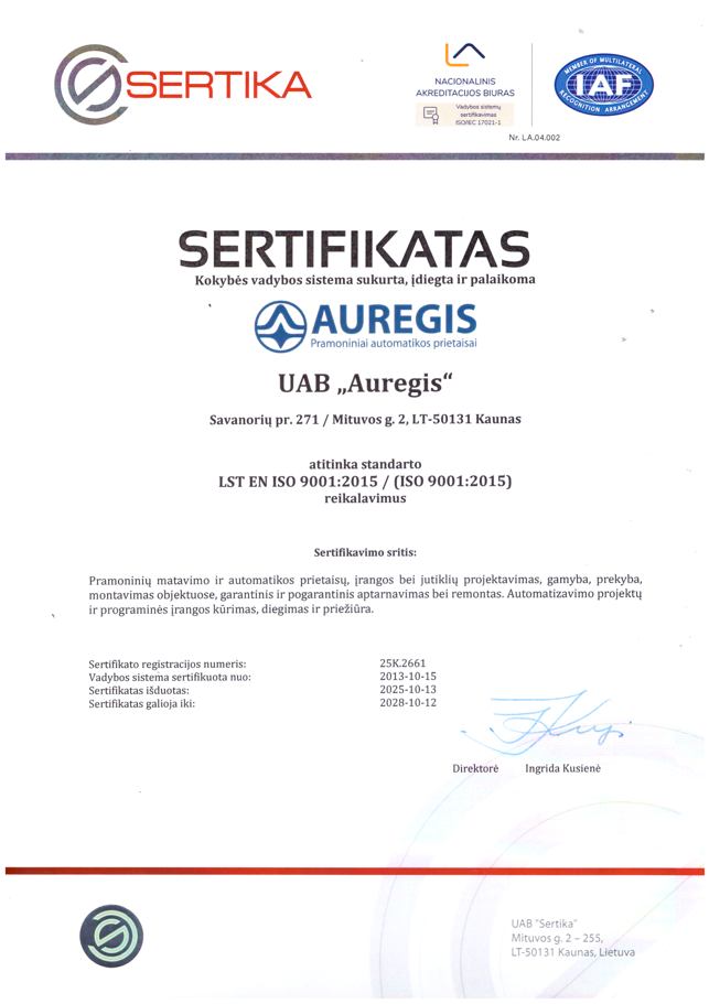 AUREGIS UAB įdiegta kokybės valdymo sistema 9001.